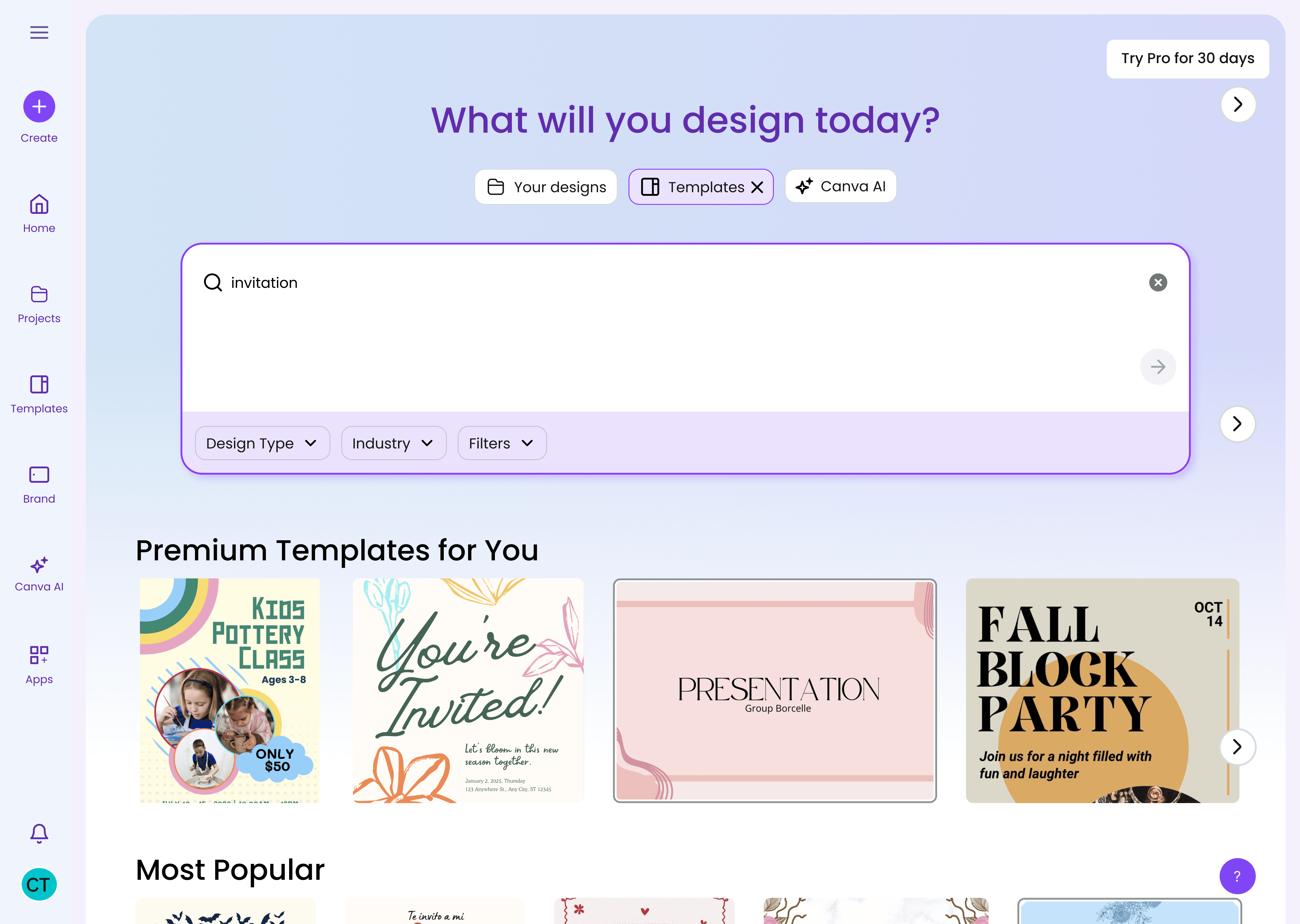 I explored competitors in the space and discovered an opportunity space for Canva to promote Pro Exclusive Templates and other Canva products through a more organized search results layout.